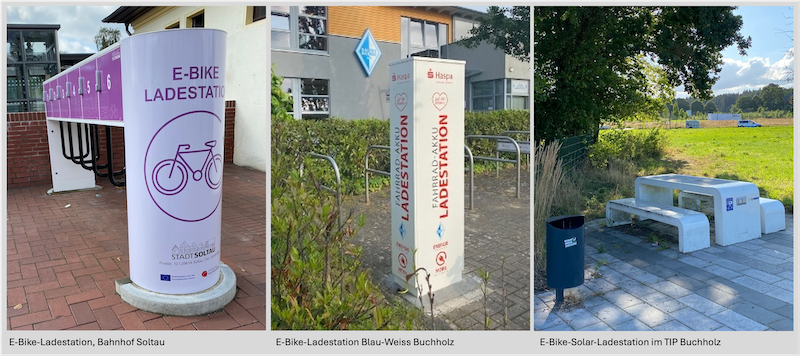 Toll wären weitere öffentlich zugängliche Ladestationen in der Innenstadt, am Bahnhof und an möglichen Rastplätzen der touristischen Radwege. Es gibt inzwischen viele verschiedene Modelle, siehe beispielhaft die E-Bike-Ladestation am Soltauer Bahnhof (Foto links).