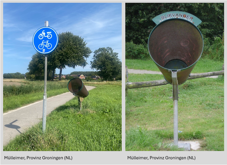 Solche schrägen Mülleimer sieht man in der Provinz Groningen häufiger. Sie erhöhen die Treffsicherheit beim Einwerfen von Müll während der Fahrt. Sicherlich nicht entscheidend, aber eine Kleinigkeit, die den Radfahrenden zeigt, sie sind hier willkommen. Genial, oder? Auch solche vermeintlich nebensächliche Maßnahmen wirken und machen einen Radweg einladend für seine Benutzer:innen. Solche Mülleimer könnten wir uns in Buchholz an den sog. Bequem&Sicher-Routen vorstellen. Habt ihr weitere Vorschläge für Standorte? Dann schreibt uns diese gerne an info@buchholz-faehrt-rad.de