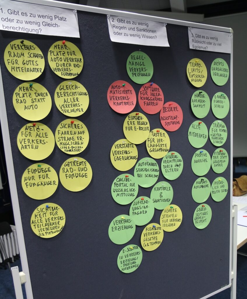 Um diese und ähnliche Fragen ging es gestern Abend in der Veranstaltung „Rücksicht statt Rage“ des Klimaforums Buchholz, organisiert vom Klimateam „Mobilität“ im Rahmen der Europäischen Mobilitätswoche. Ca. 50 Gäste waren gekommen, um dem Impulsvortrag von Kirsten Lühmann, Präsidentin der Deutschen Verkehrswacht, und der sich anschließenden Diskussion mit Frau Lühmann, Martha Vogelsang (Vertreterin Fußverkehr), Rosanna Sievers (ADAC Hansa, Vertreterin Autoverkehr) und unserem Vorsitzenden Peter Eckhoff (Vertreter Radverkehr) zu folgen. Moderiert wurde die Veranstaltung von Grit Weiland und Michael Wiese aus dem Klimateam Mobilität. Vorschläge zur Lösung des Problems wurden gesammelt und festgehalten (siehe Foto).